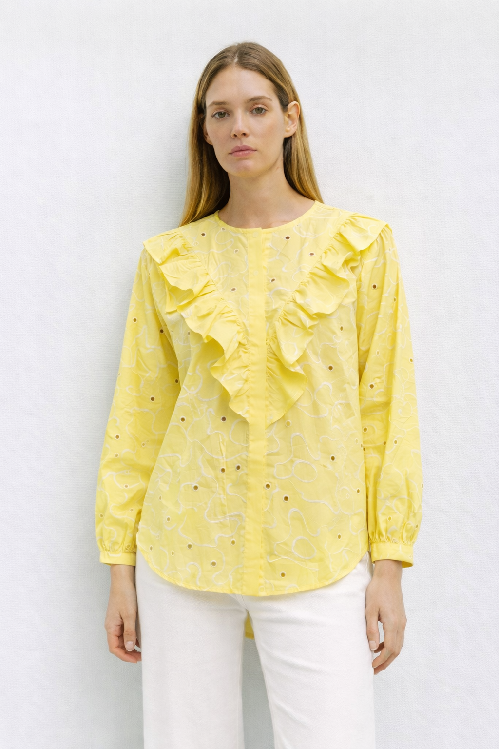 Product DescriptionEmbroidered yellow pure cotton top with bishop sleeves and ruffle details at neckline. Feminine...