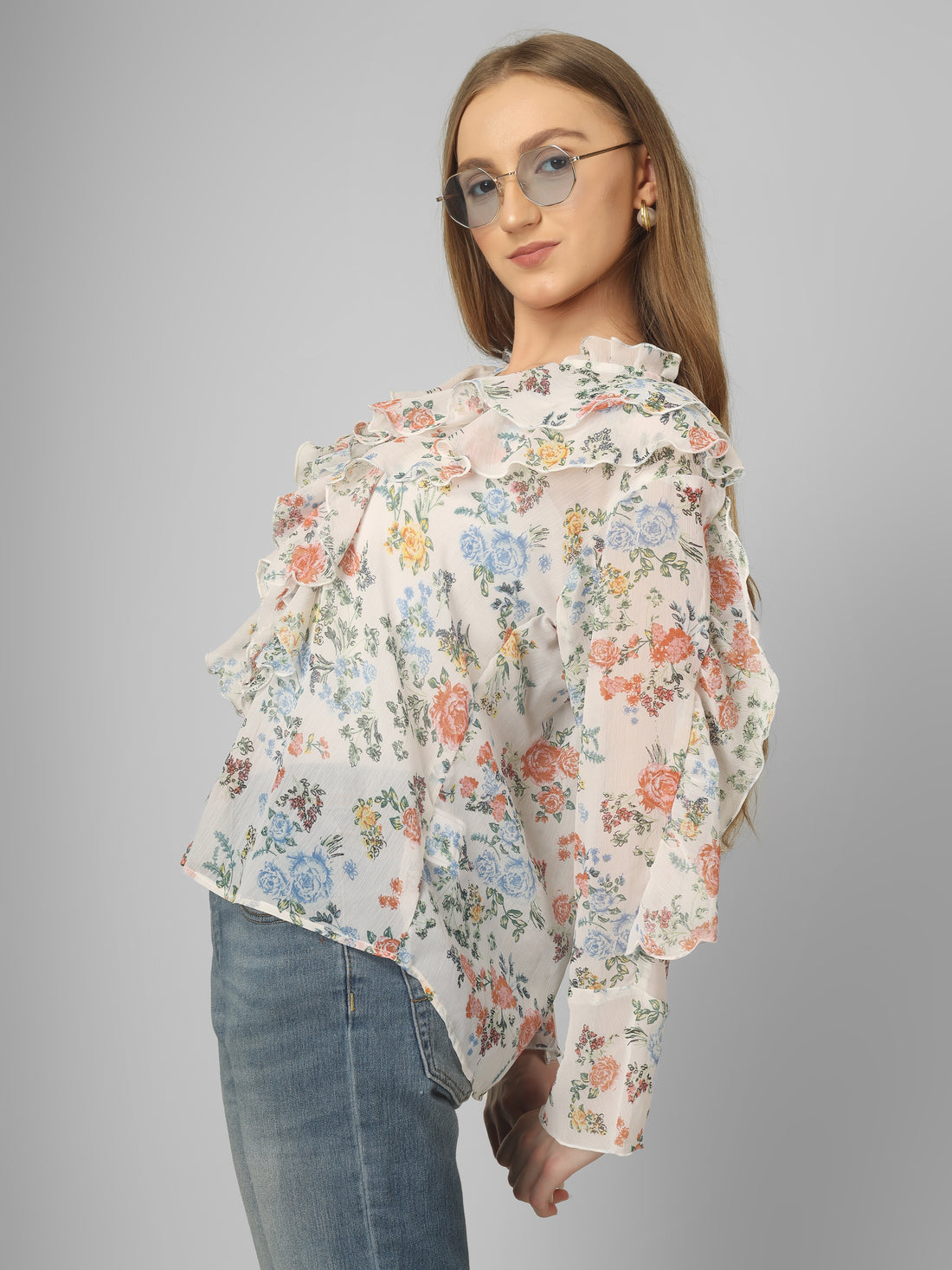 Product DescriptionStatement white chiffon printed top with stand collar, dramatic ruffle full sleeves, and a...