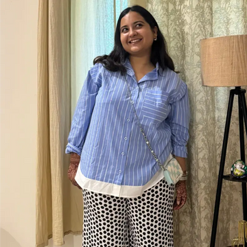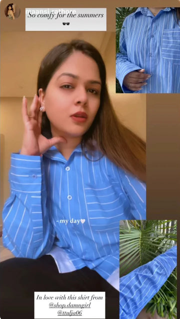 Product DescriptionA blue and white striped shirt featuring a clean white designed element at the...