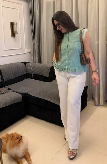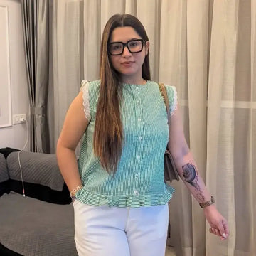 Product DescriptionA fresh green & white striped top with dainty lace detailing at the armholes...