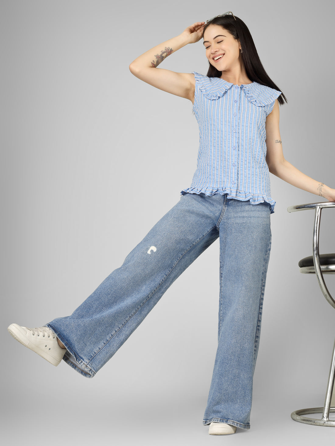 Product DescriptionStatement blue top with peterpan collar, frill detail at hem and a regular cute...