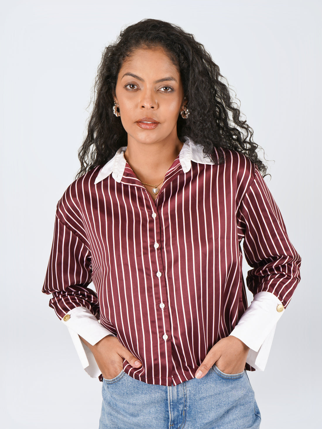 Product Description A boxy burgundy striped shirt featuring crisp white poplin collar and broad cuffs,...