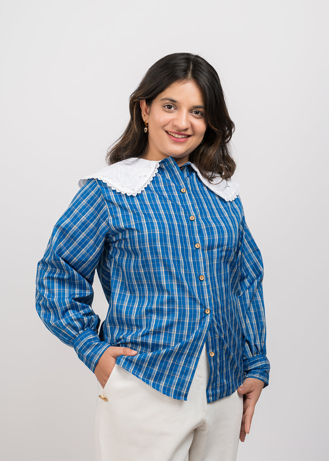 Product DescriptionClassic blue checks shirt with cuffed sleeves, cotton embroidered - lace peterpan collar, and...