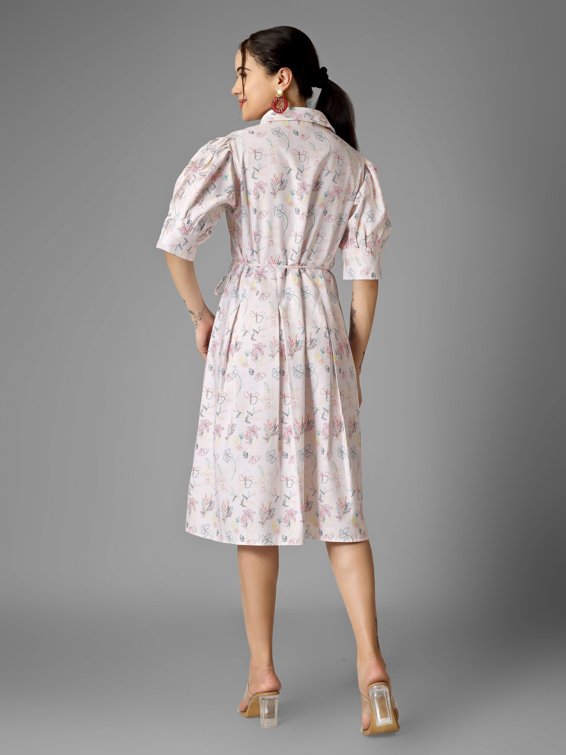 Printed puff sleeve midi dress with box pleat detail at waist. Belt detail and pocket on one side. Easy and bloomy for day out or brunch.