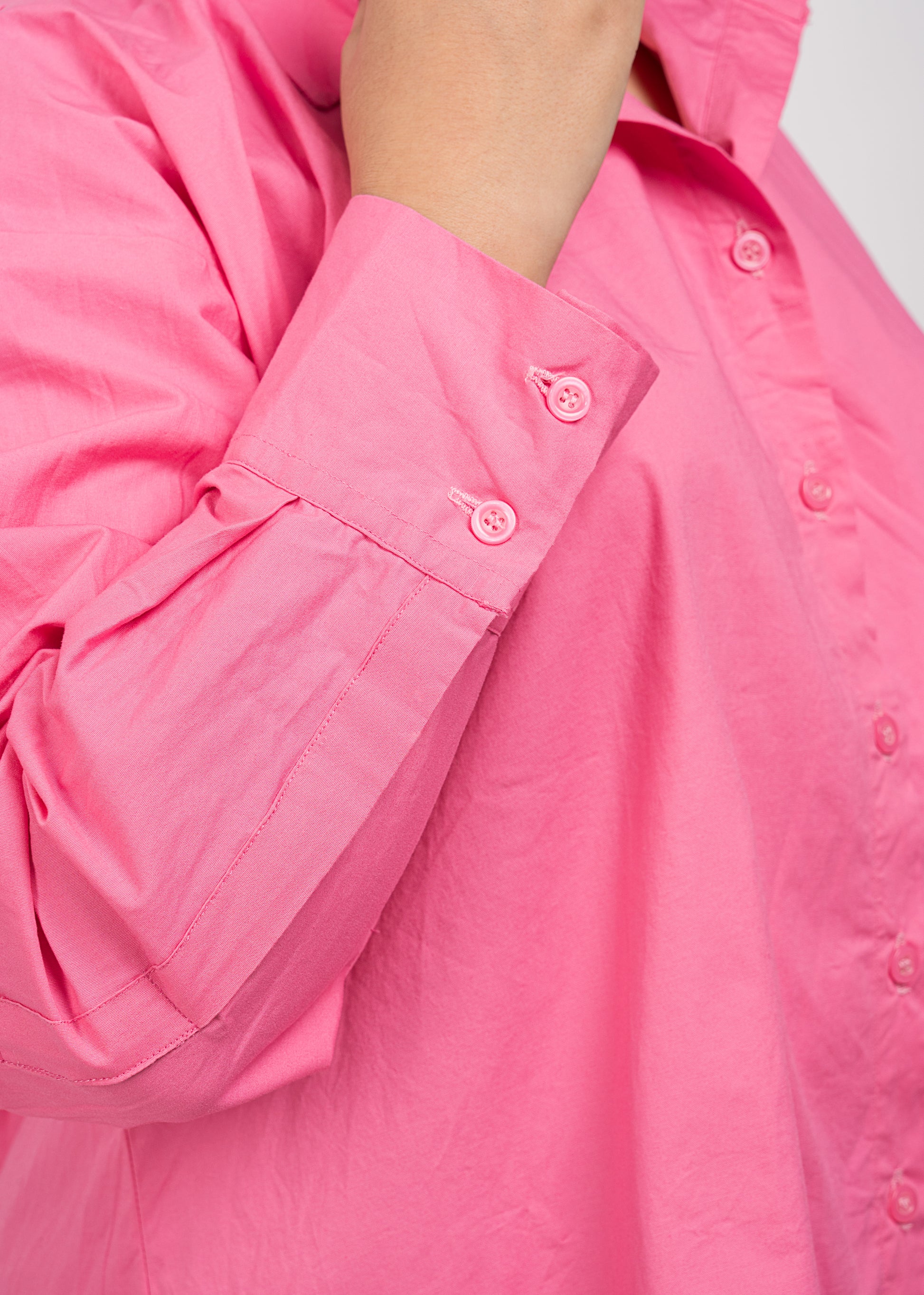 Oversized hot pink poplin shirt with cuffed sleeves and a statement collar. Bold and relaxed.