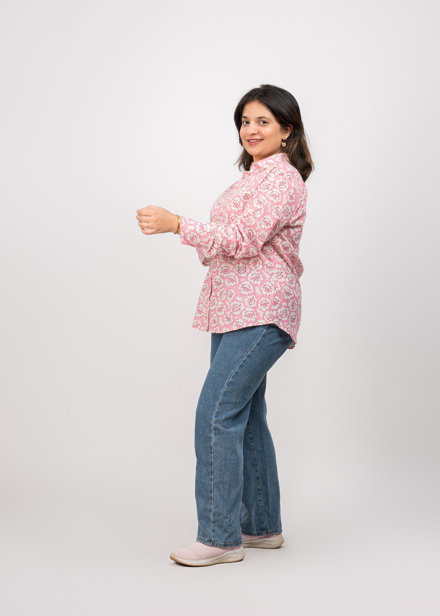 Printed pink cotton shirt with cuffed sleeves and collar. Sweet and polished.
