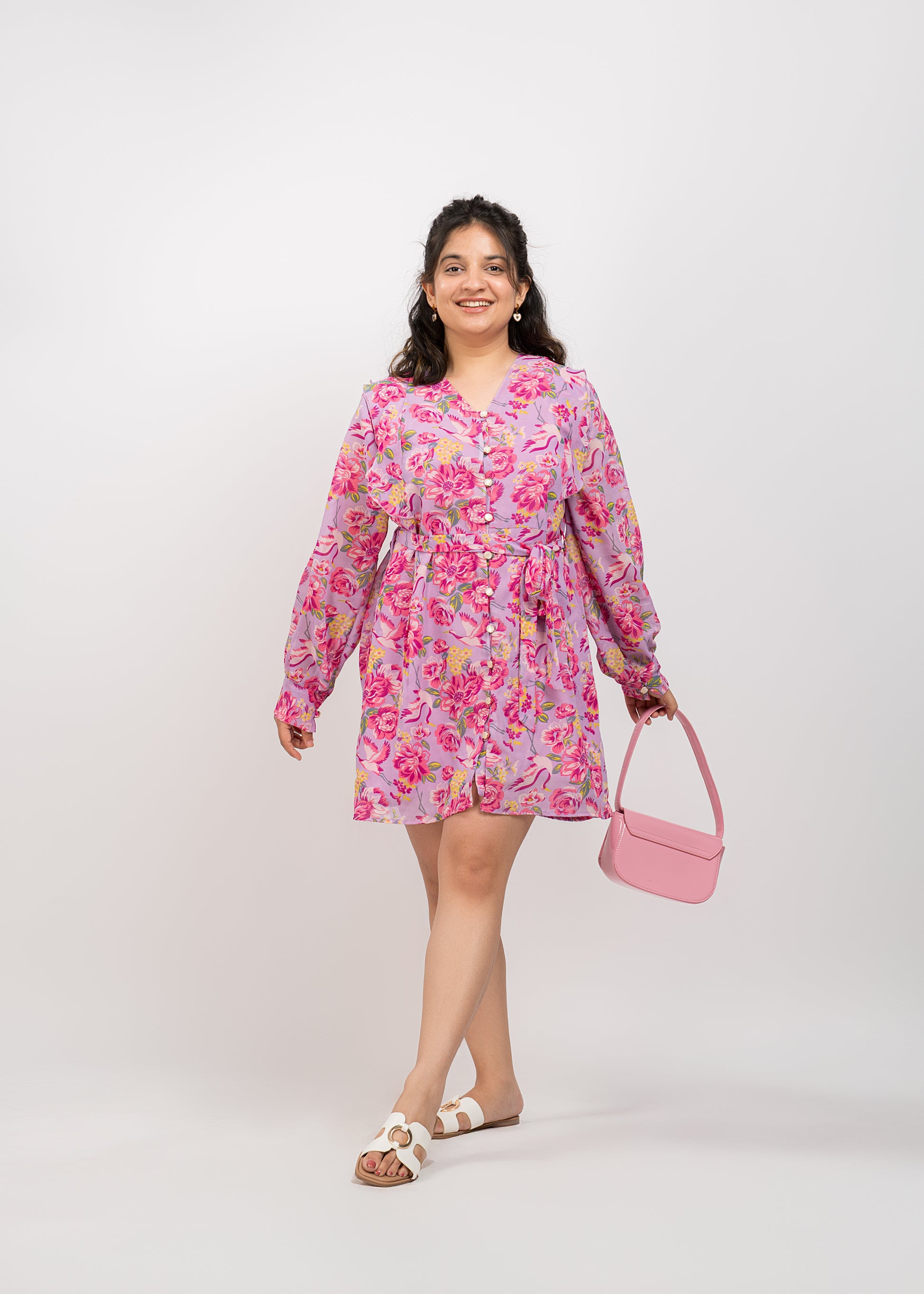 Lavender polyester dress with cuffed sleeves, printed design, and a flattering V-neckline. Frill details at front and back princess line. It comes with a fabric tie-up Belt.