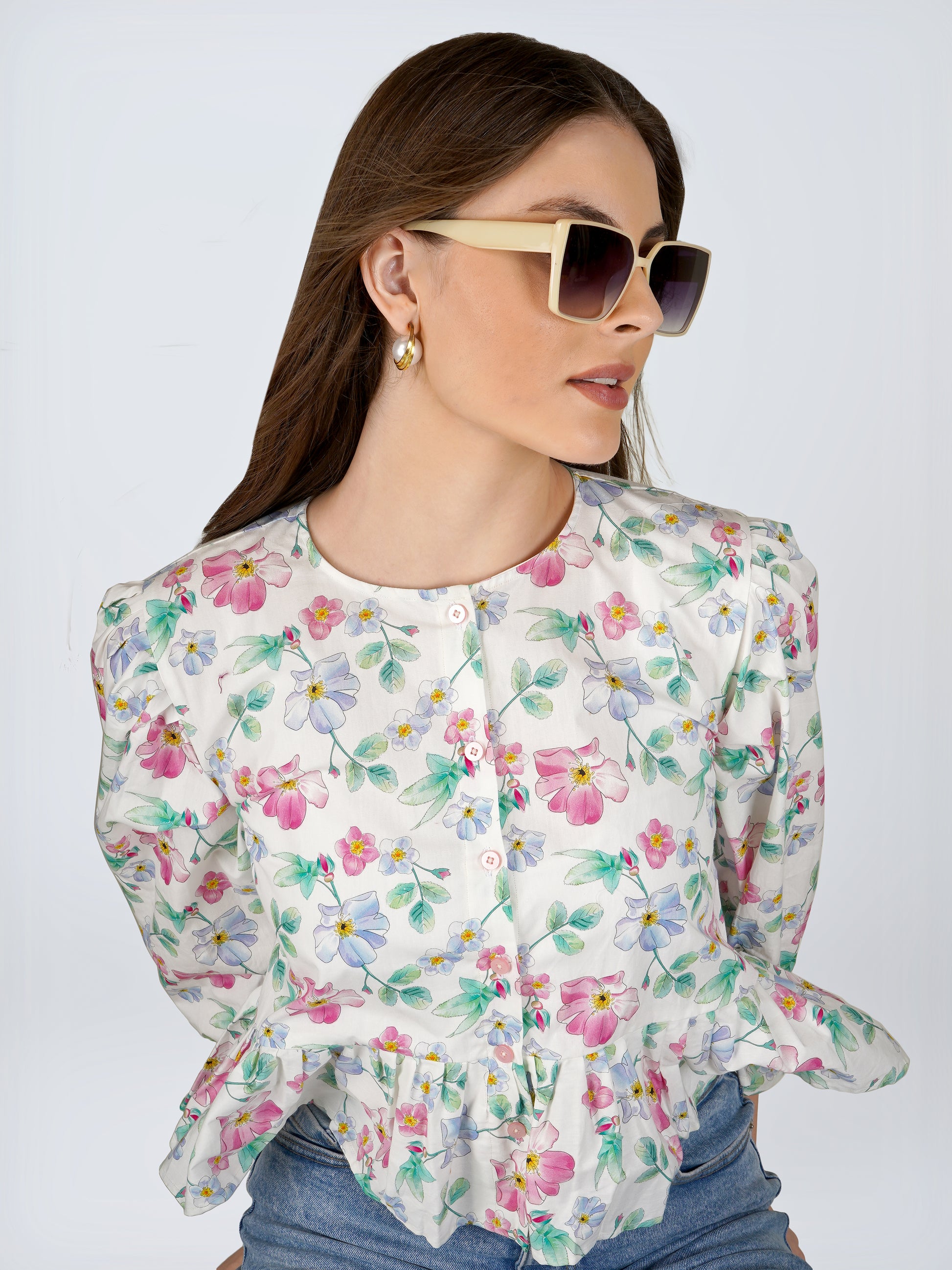 Peplum multi-coloured printed poplin top. Lightweight and playful.