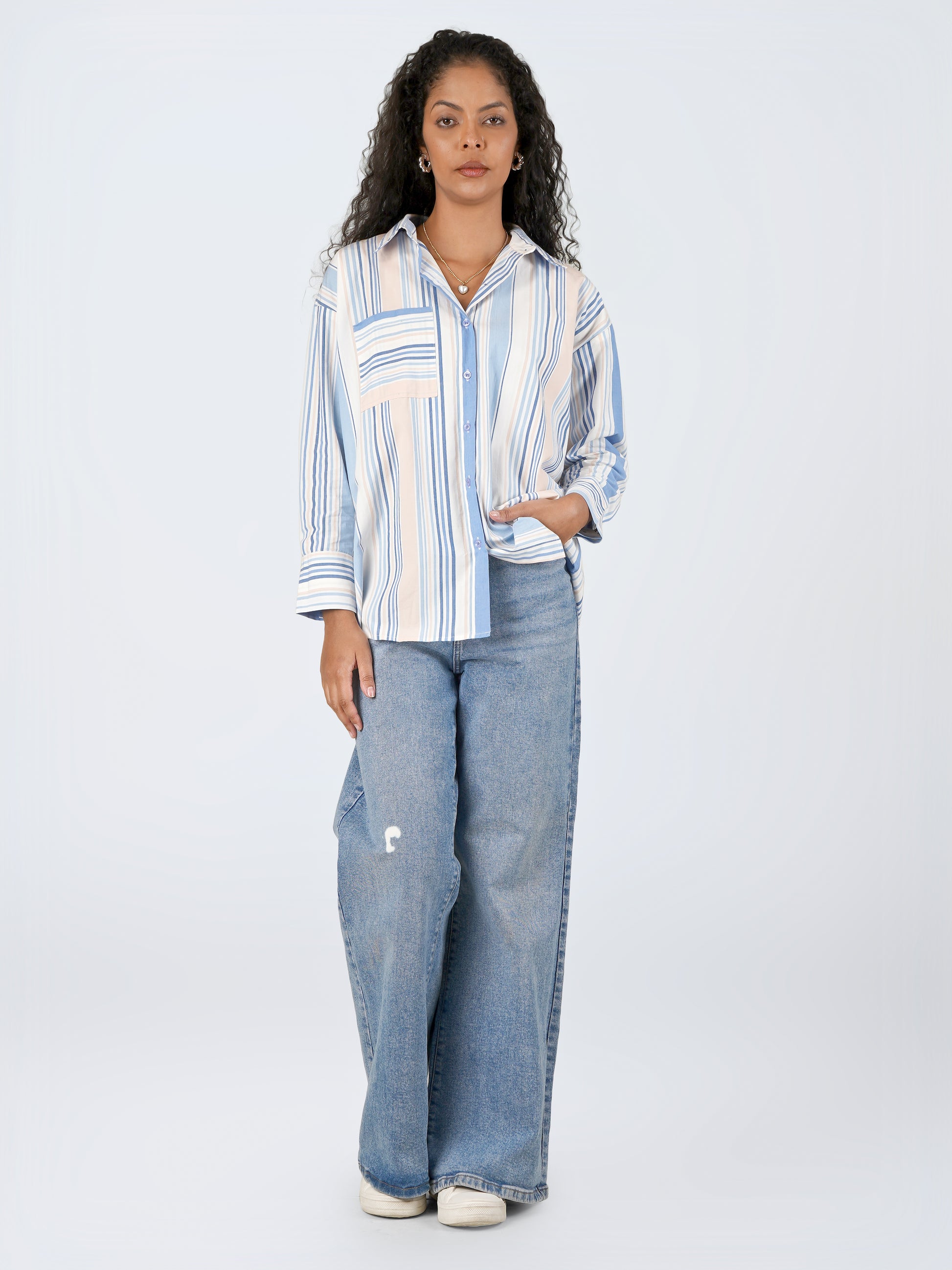 A crisp white shirt with pastel peach and blue stripes — made for light moods and easy days. Cotton comfort in a relaxed fit you’ll reach for all season.