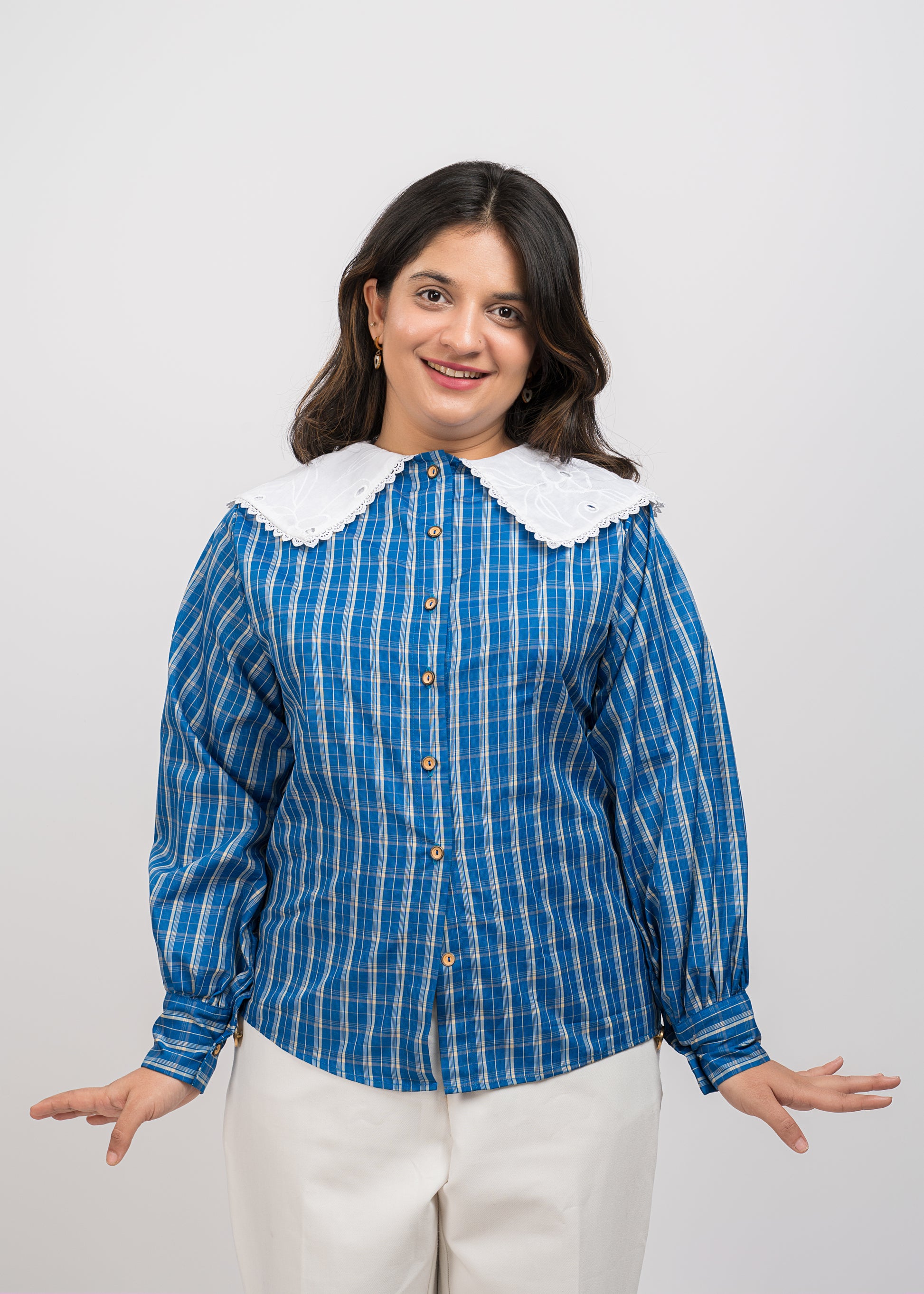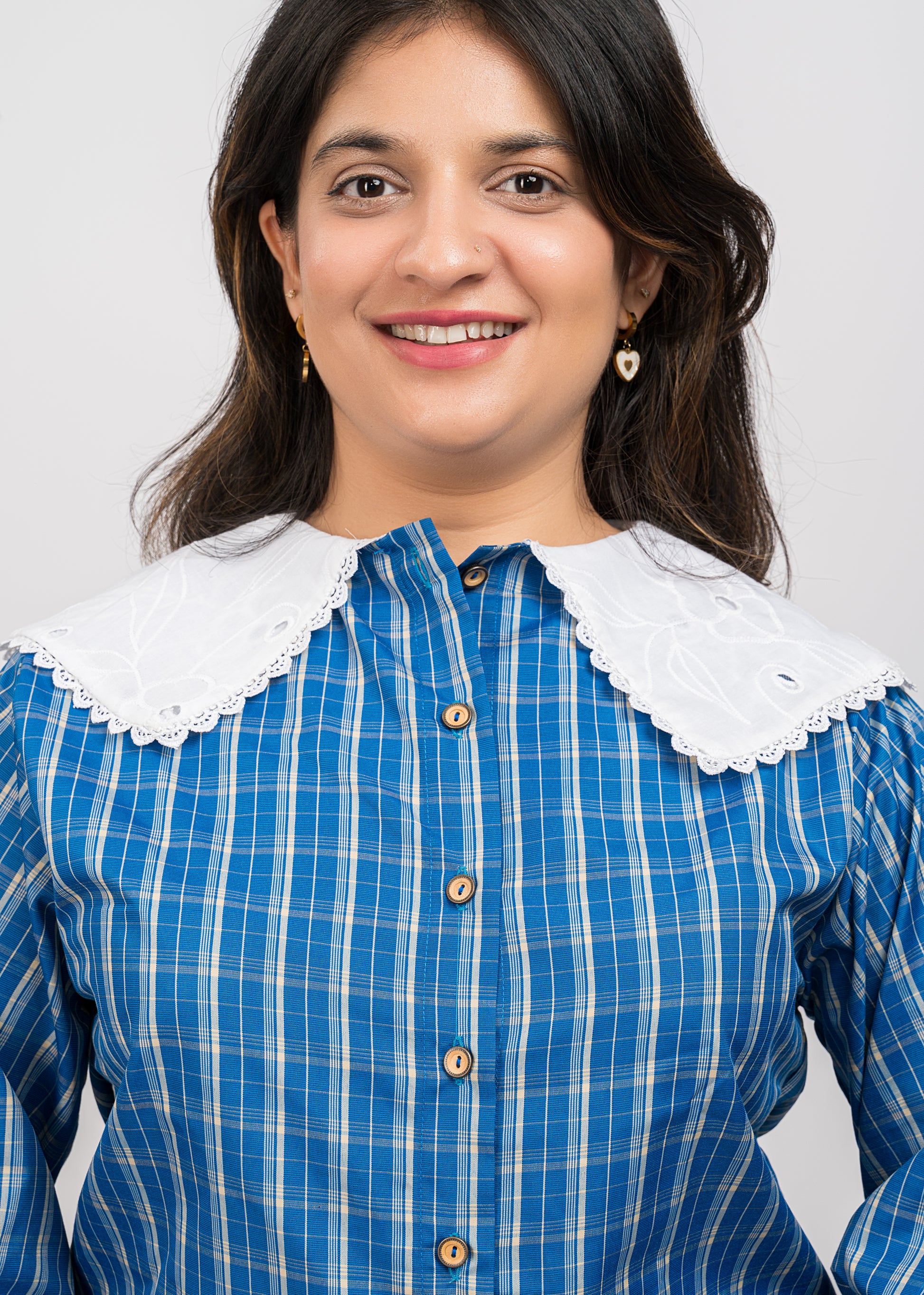 Classic blue checks shirt with cuffed sleeves, cotton embroidered - lace peterpan collar, and poly-cotton comfort.