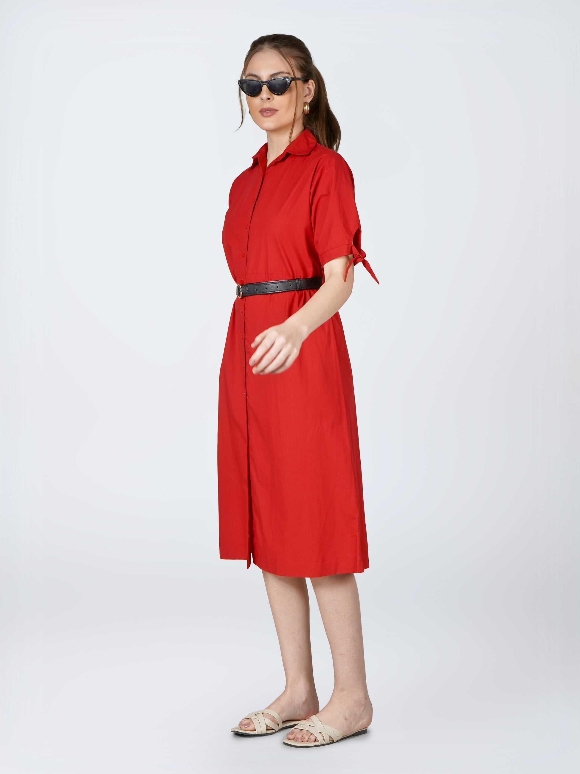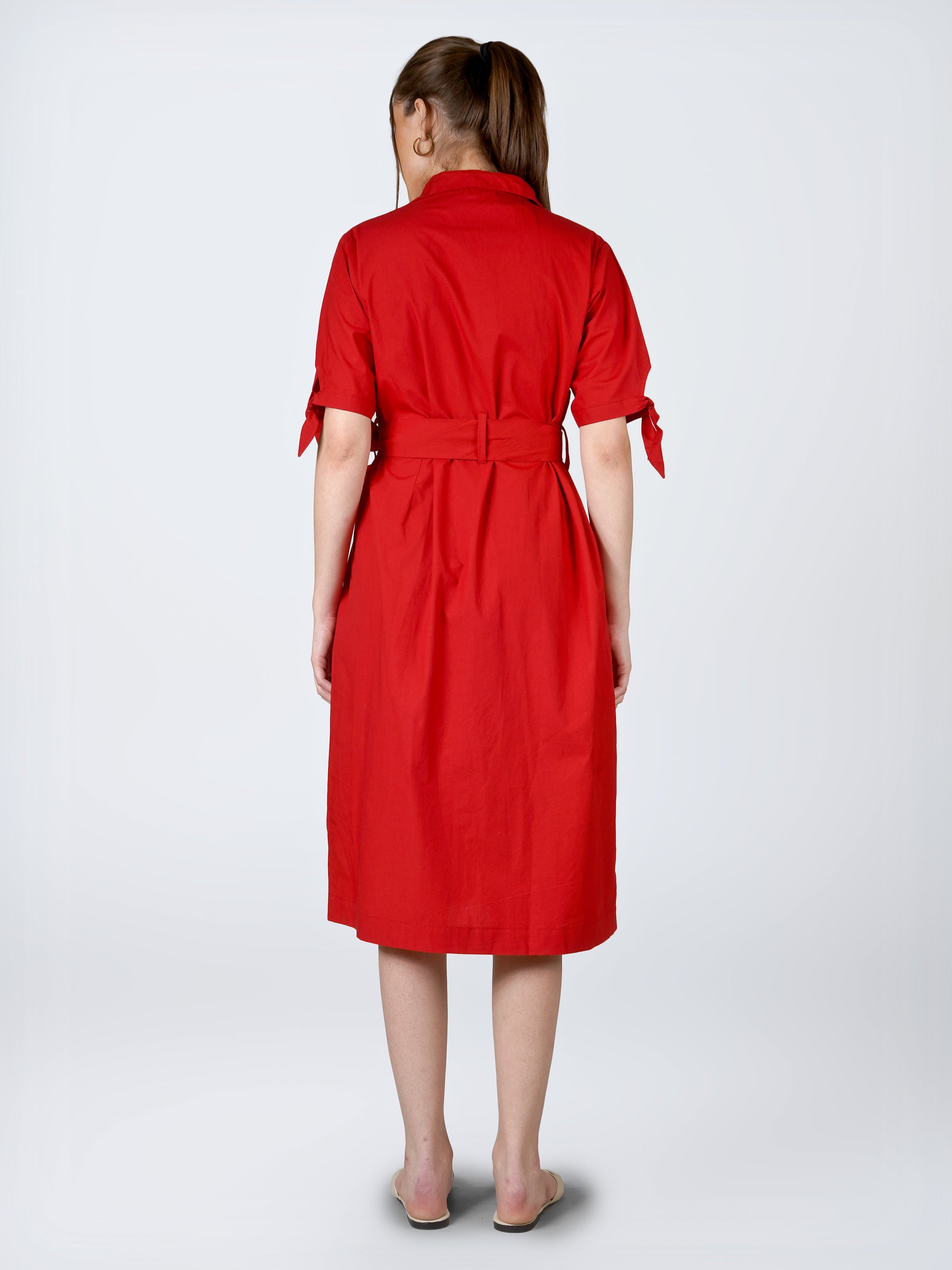 A bold red poplin midi dress with a sharp collar, button-down front, and a cinching belt for a structured silhouette.