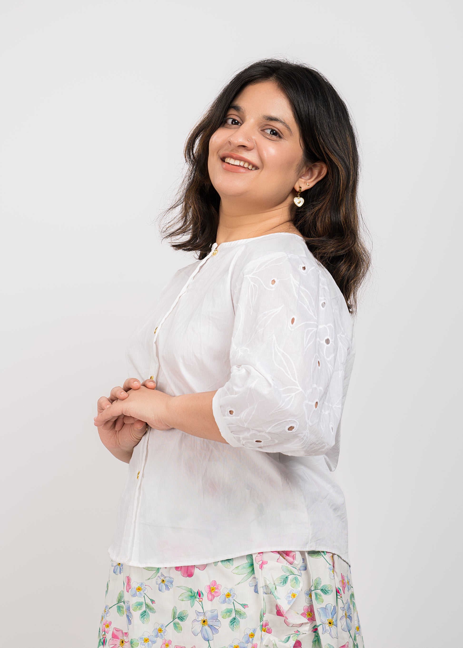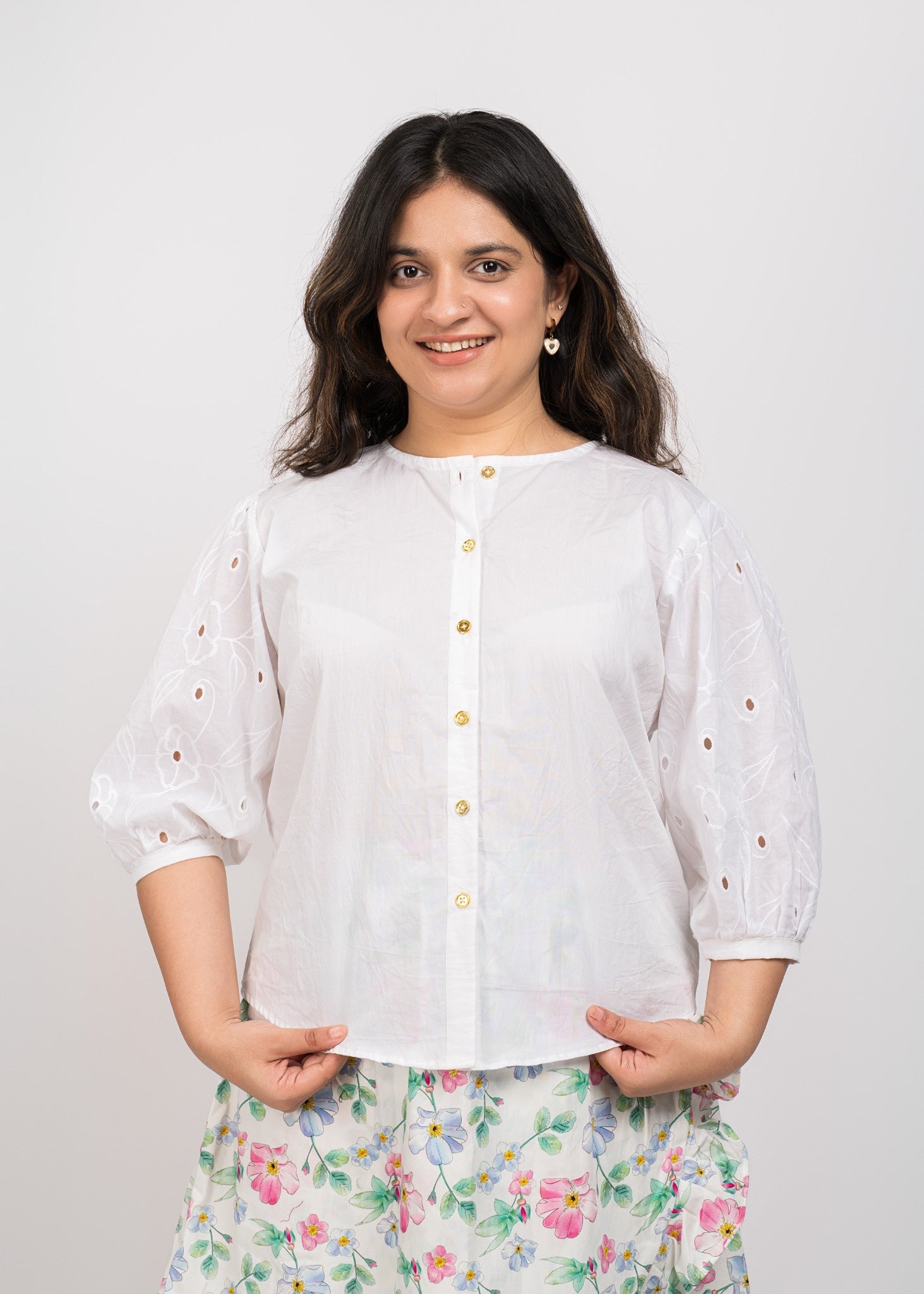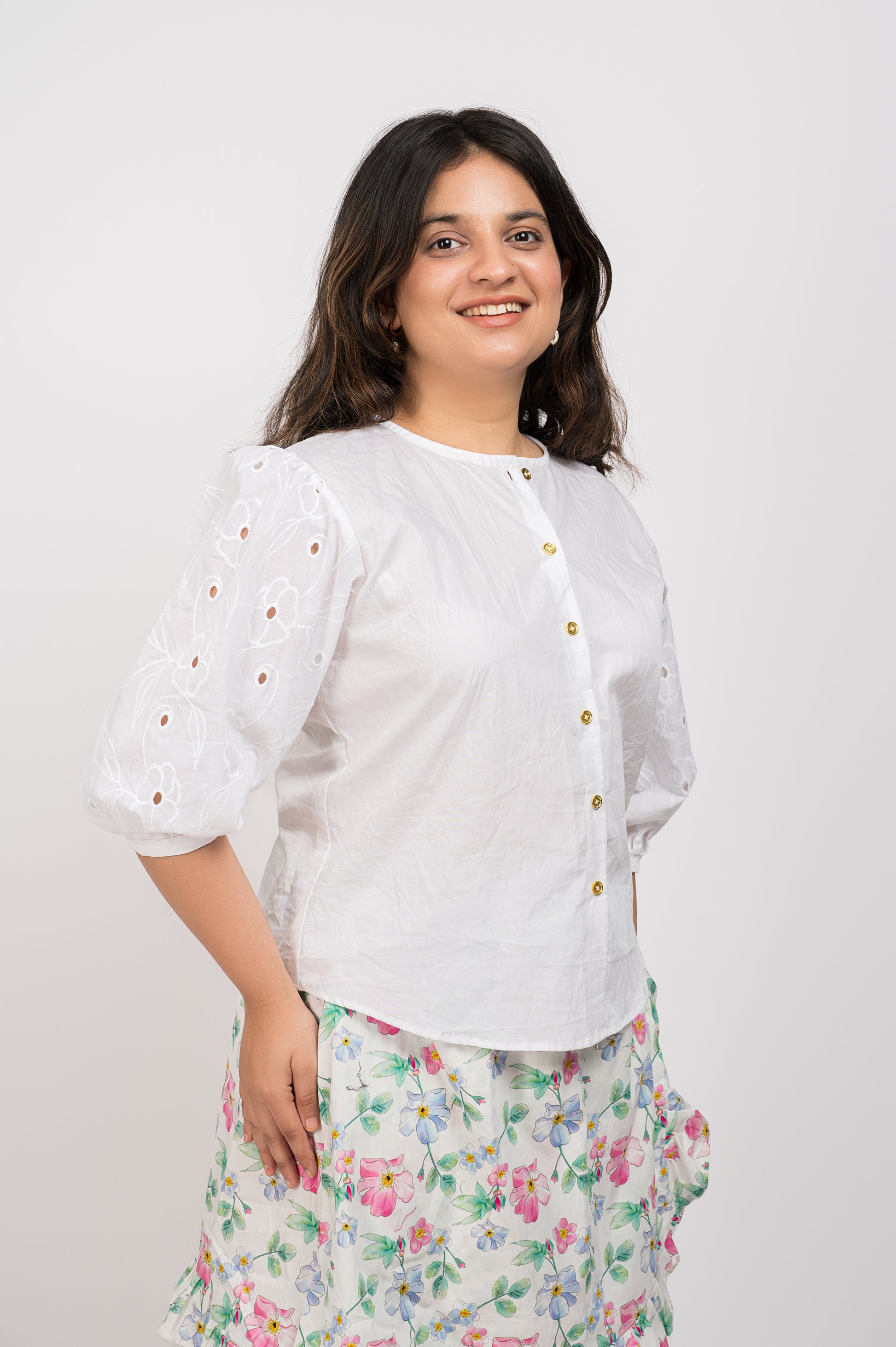 White solid poplin top with embroidered cotton band sleeves and a round neck. Clean, minimal staple.