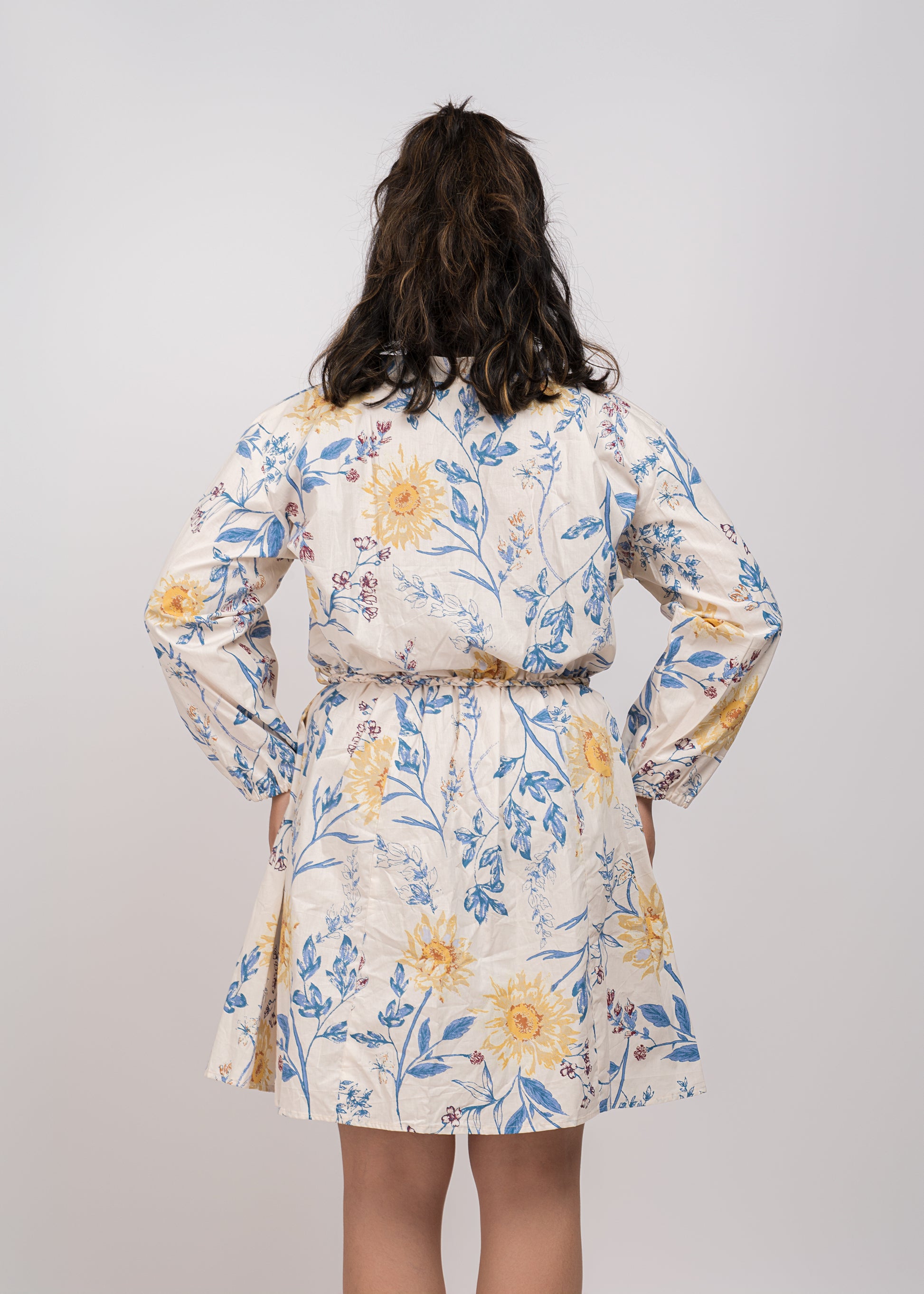 Yellow poplin dress with elasticated sleeves and flat mandarin collar. It comes with a Braided-Belt. Breezy and Bold.