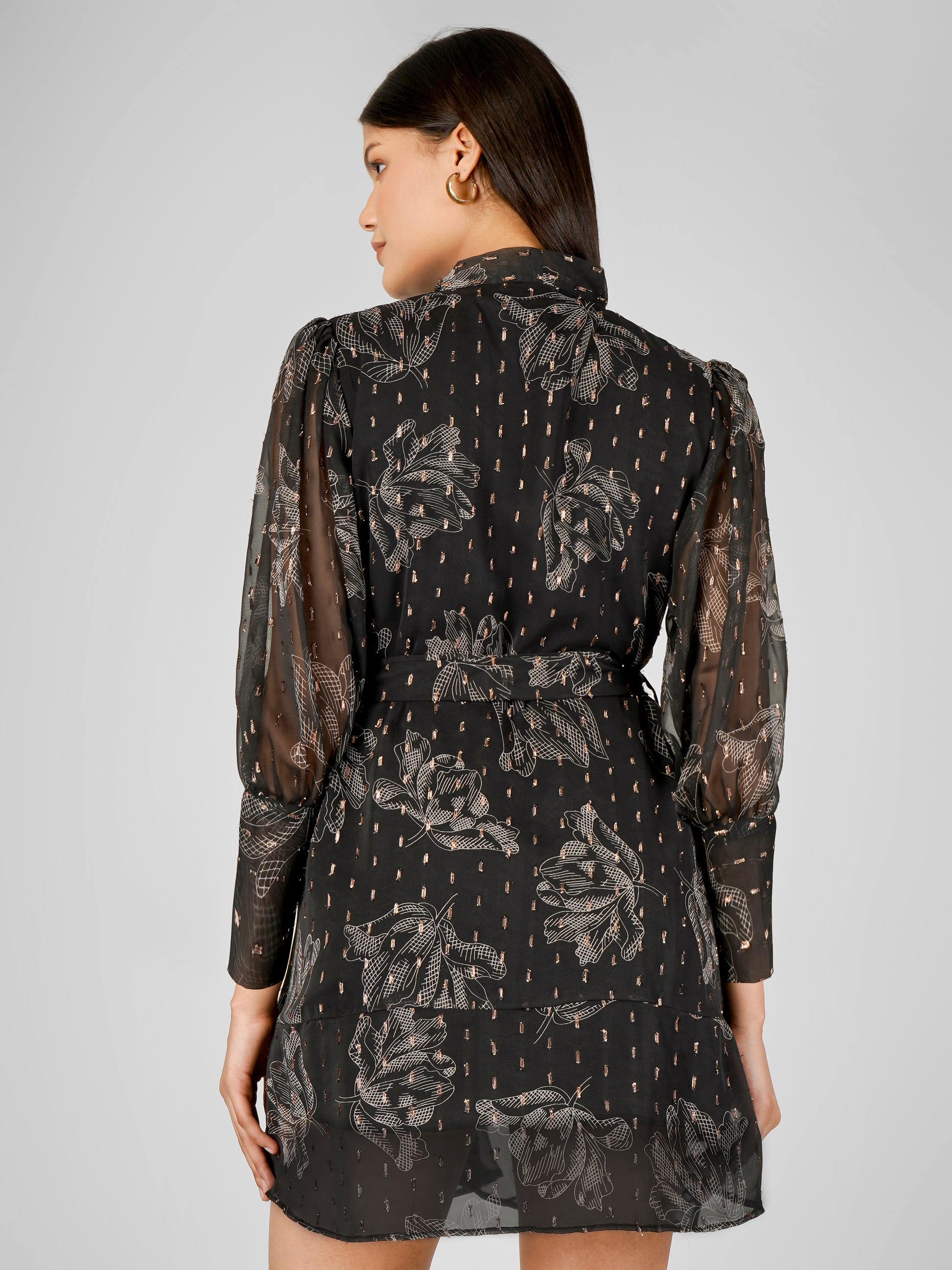 Printed black polyester dress with a shawl collar and bishop sleeves. It comes with a fabric Belt. Adds drama to your daily style.