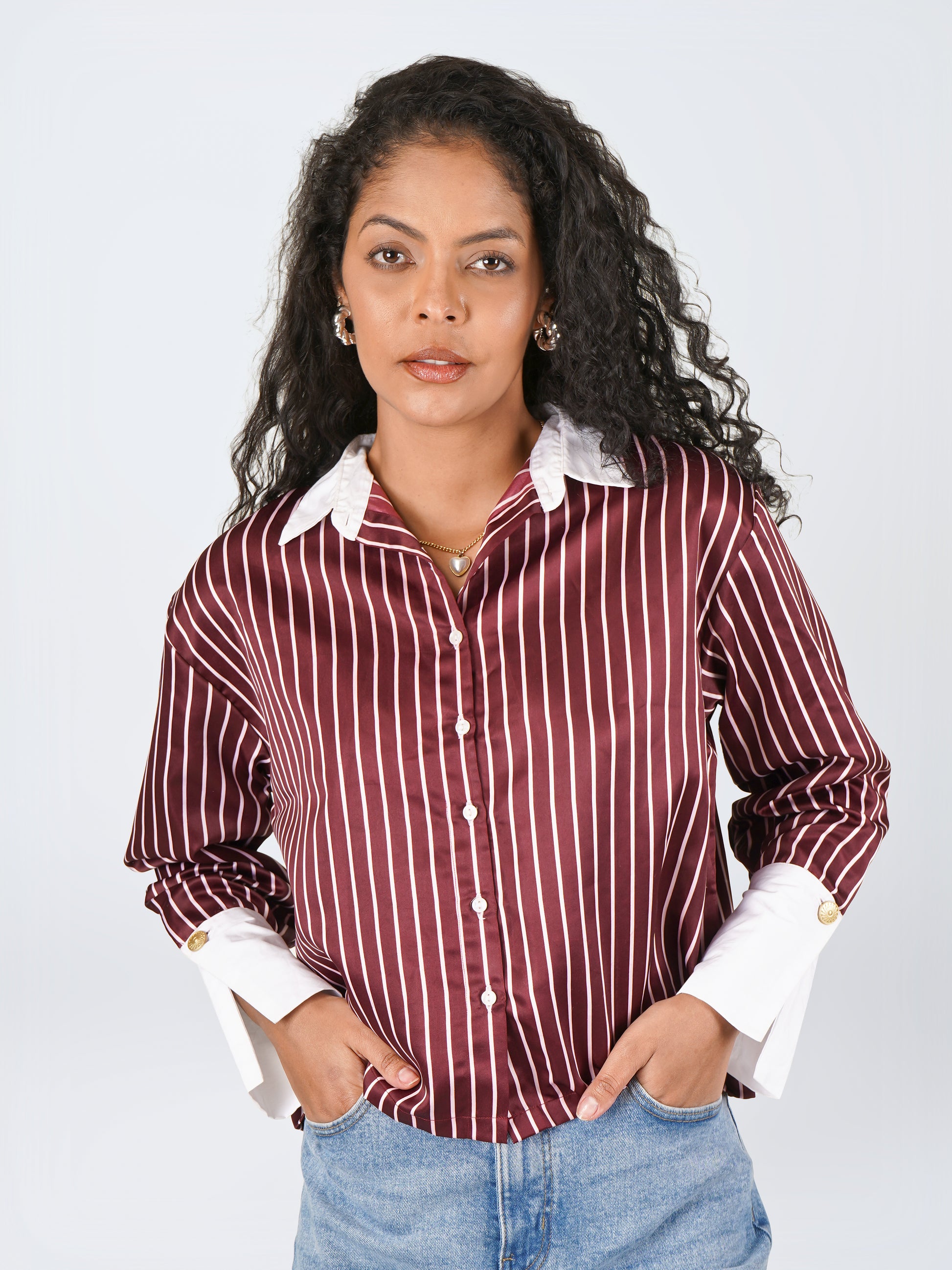 A boxy burgundy striped shirt featuring crisp white poplin collar and broad cuffs, finished with matte gold buttons at the wrist. Tailored yet effortless — your standout staple.
