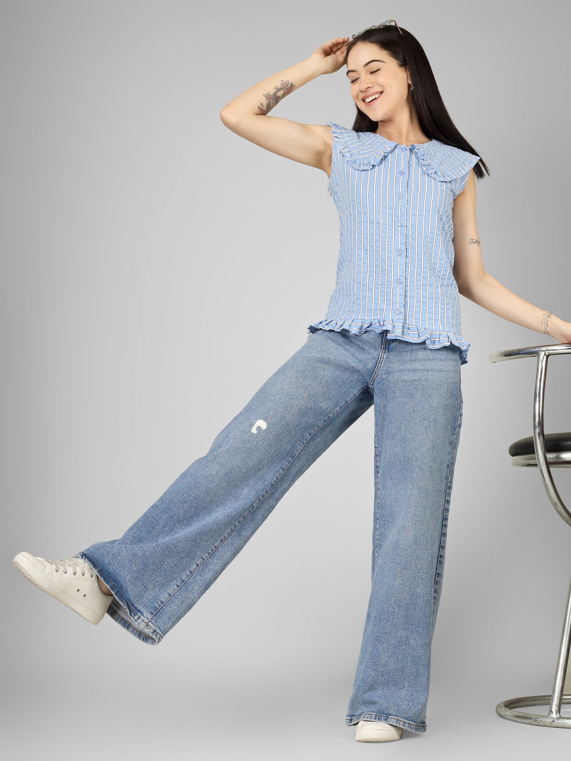 Statement blue top with peterpan collar, frill detail at hem and a regular cute fit.
