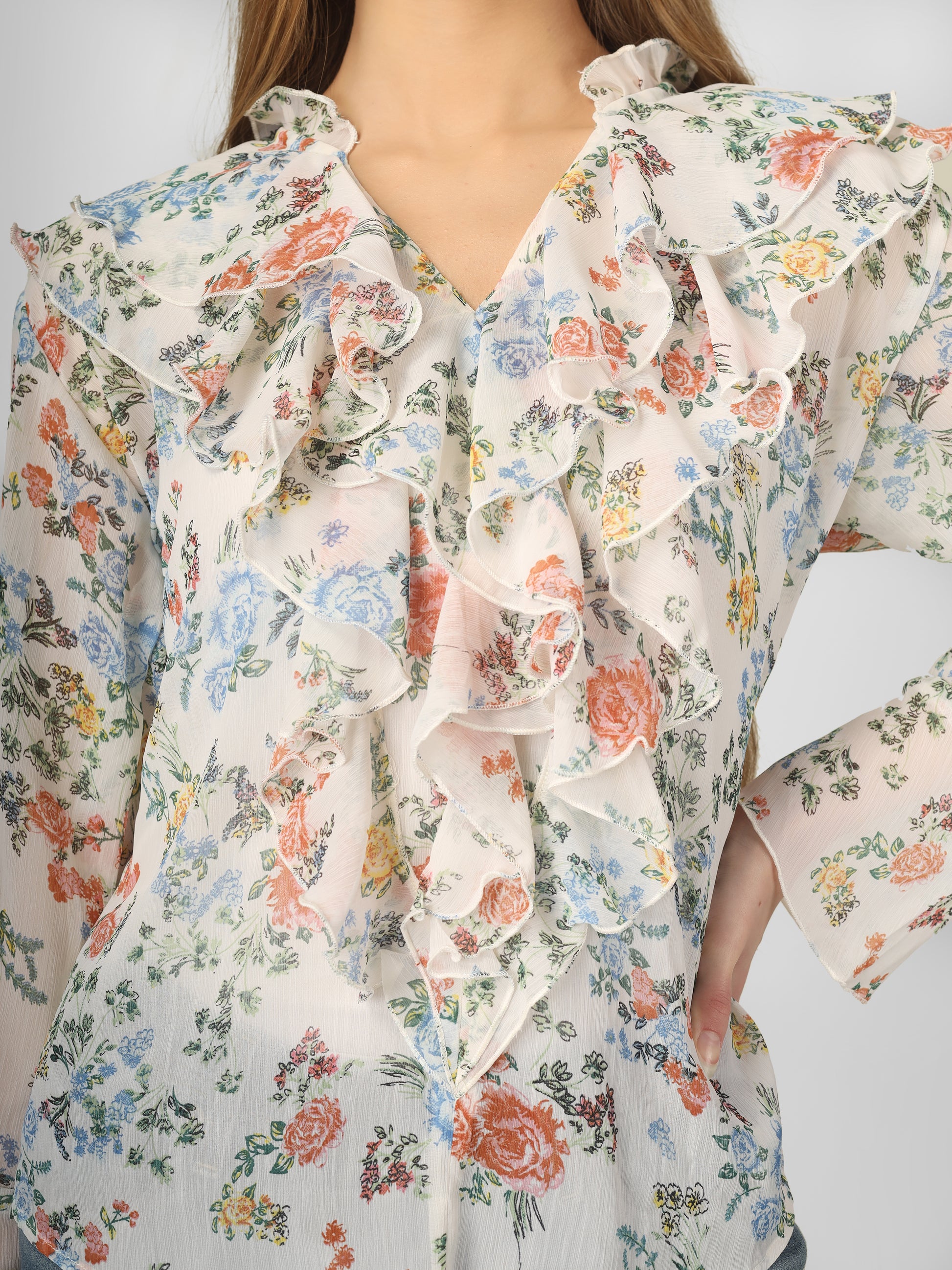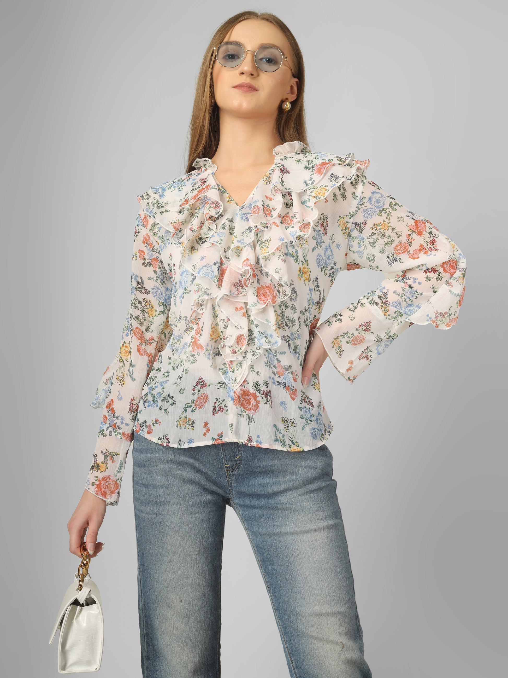 Statement white chiffon printed top with stand collar, dramatic ruffle full sleeves, and a loose chic fit.