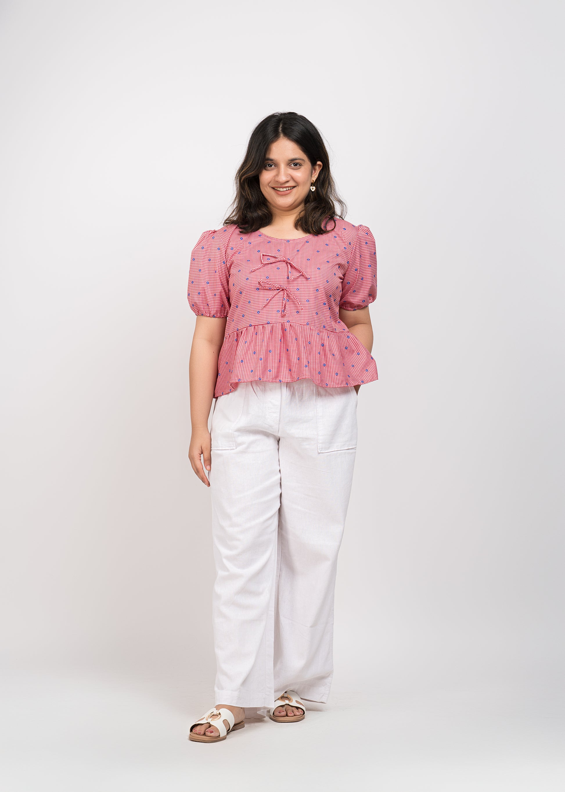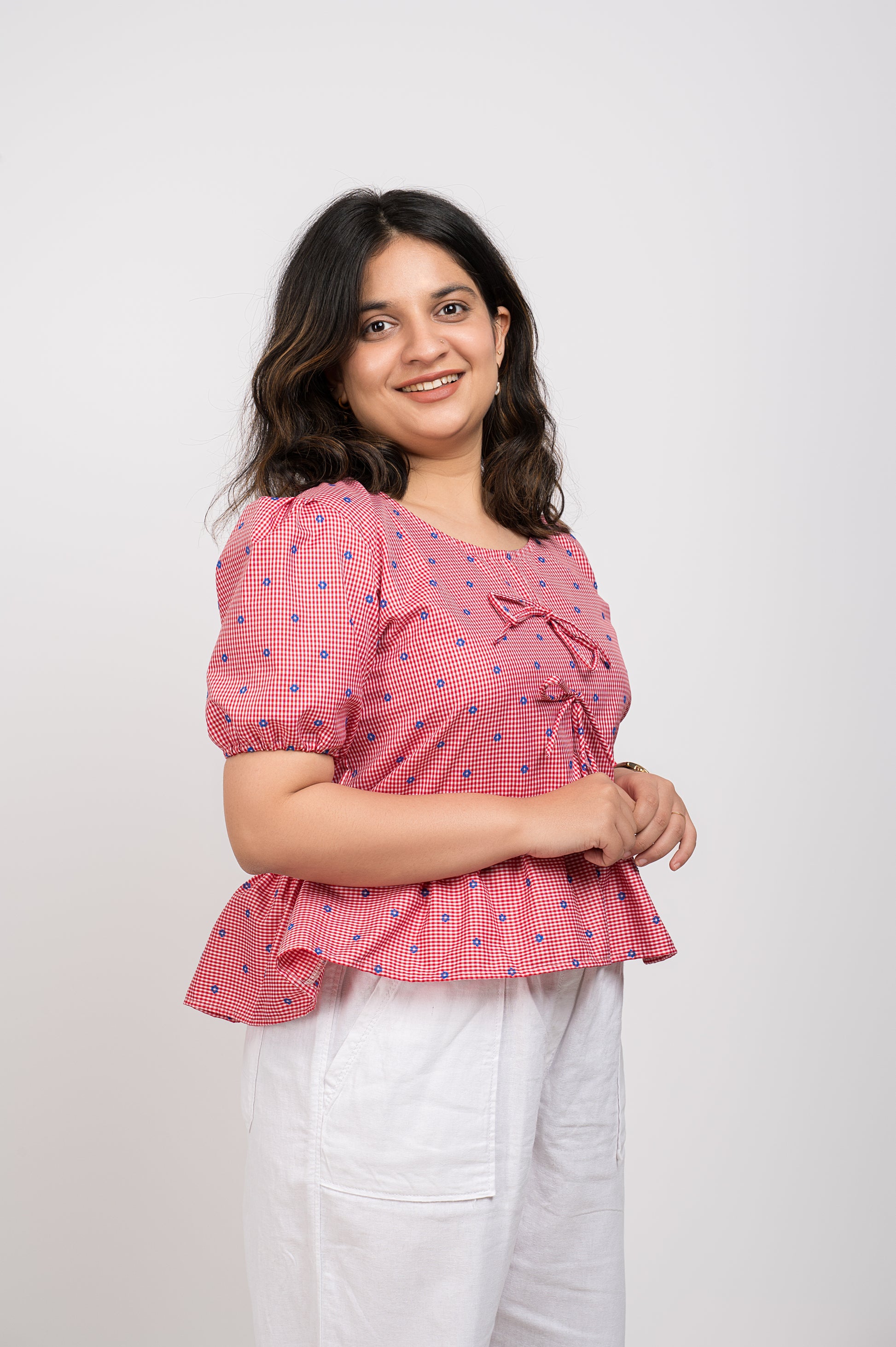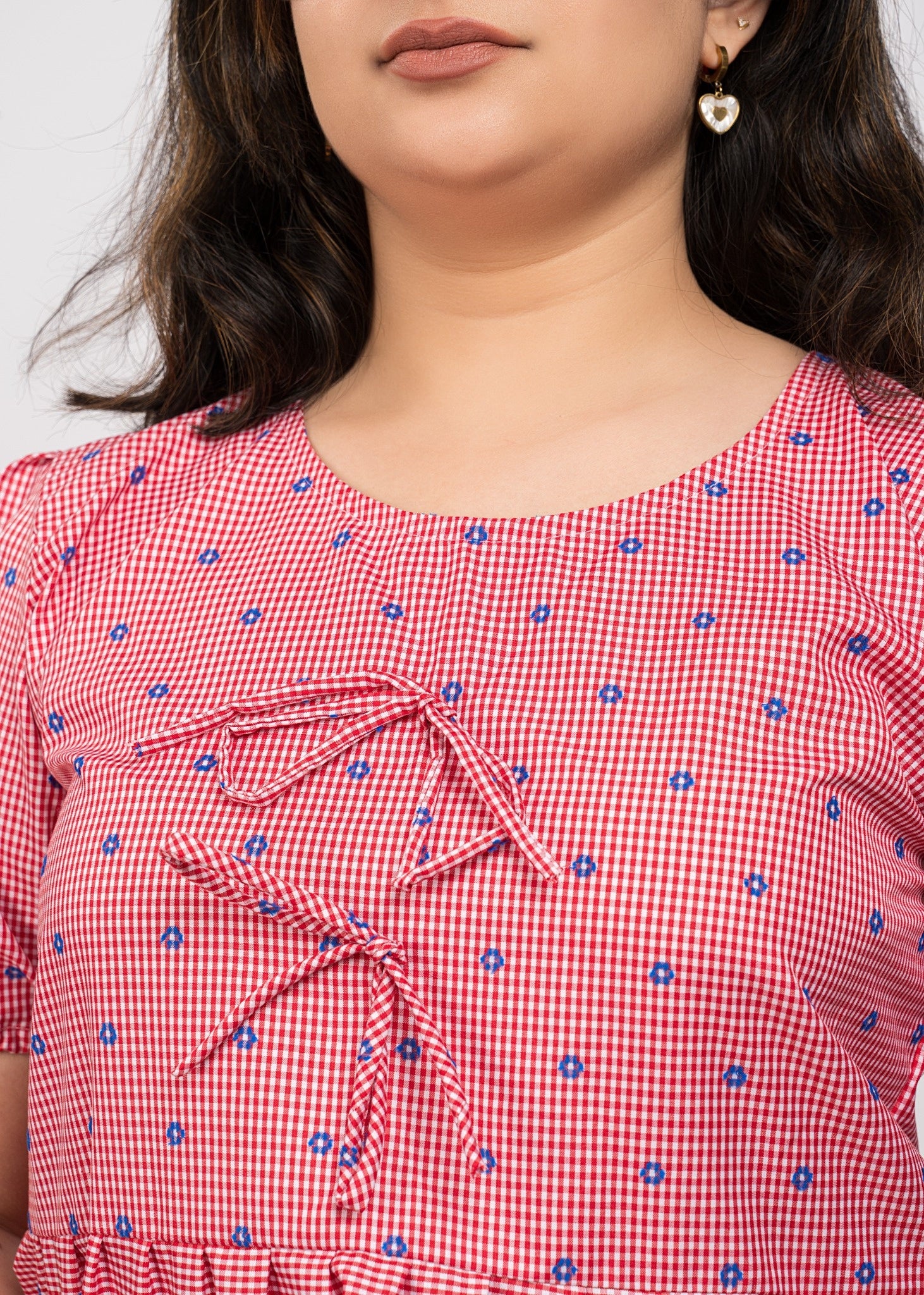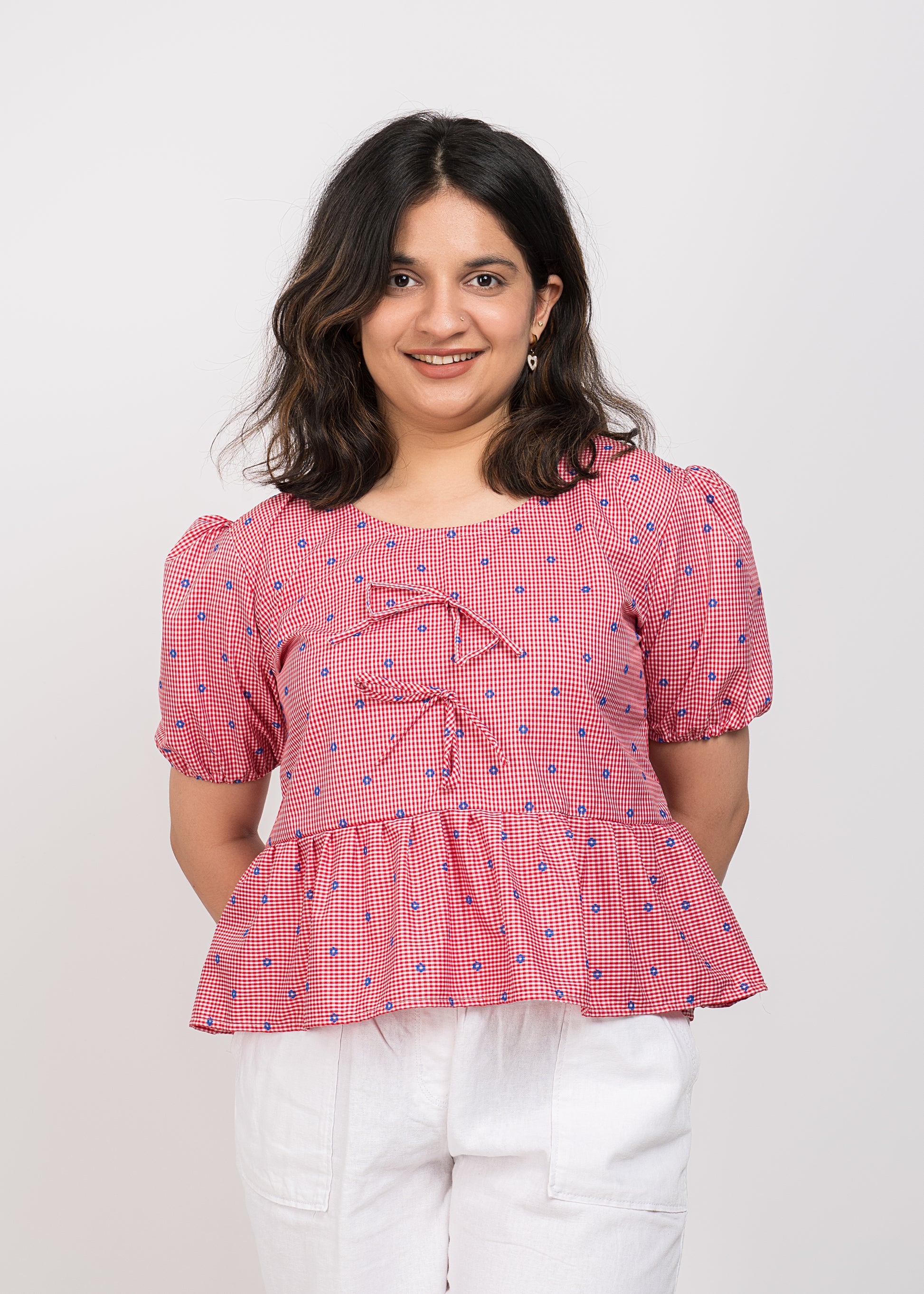 Red boxy top with checks pattern, puff sleeves, and a round neck. Cute and trendy.