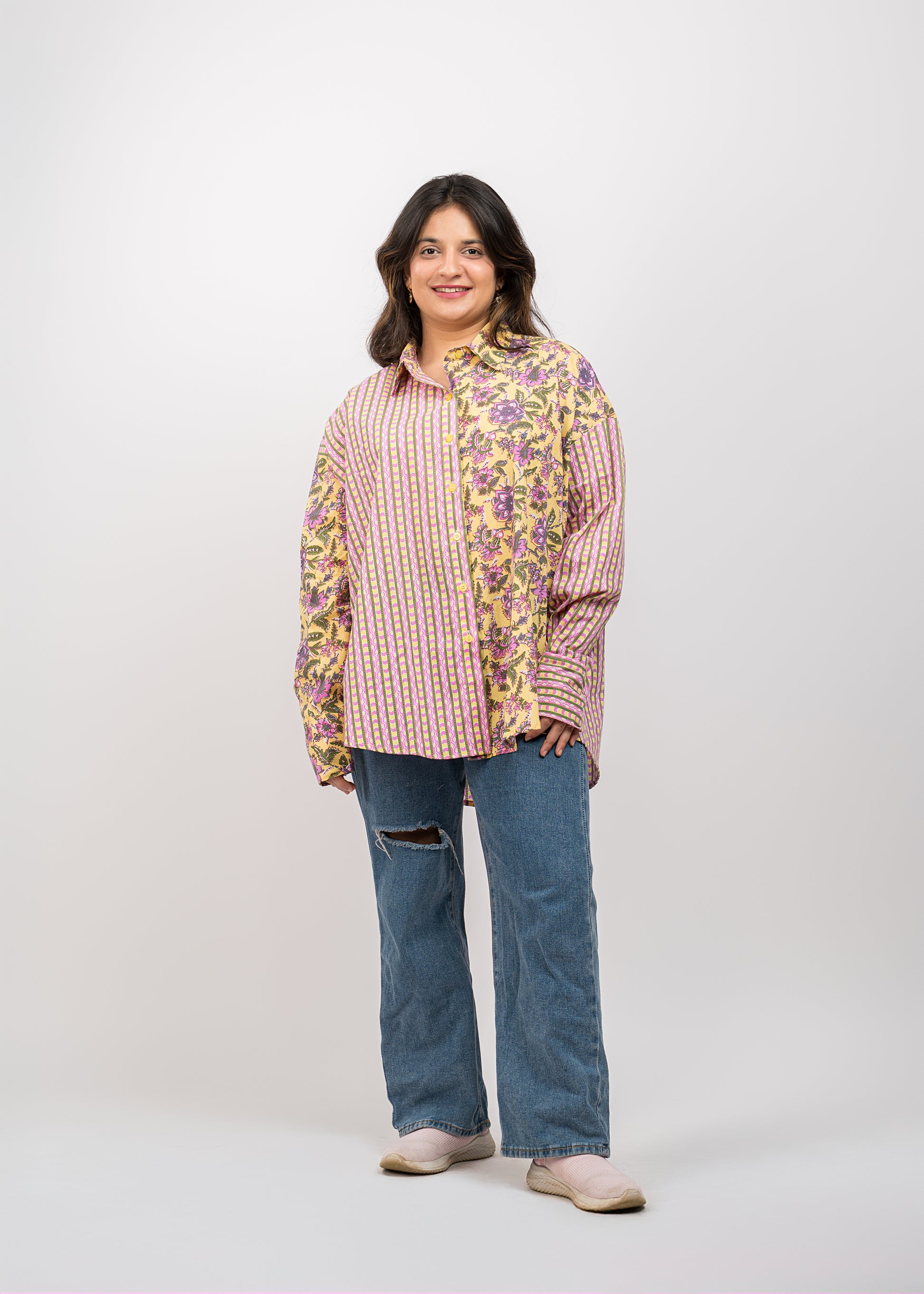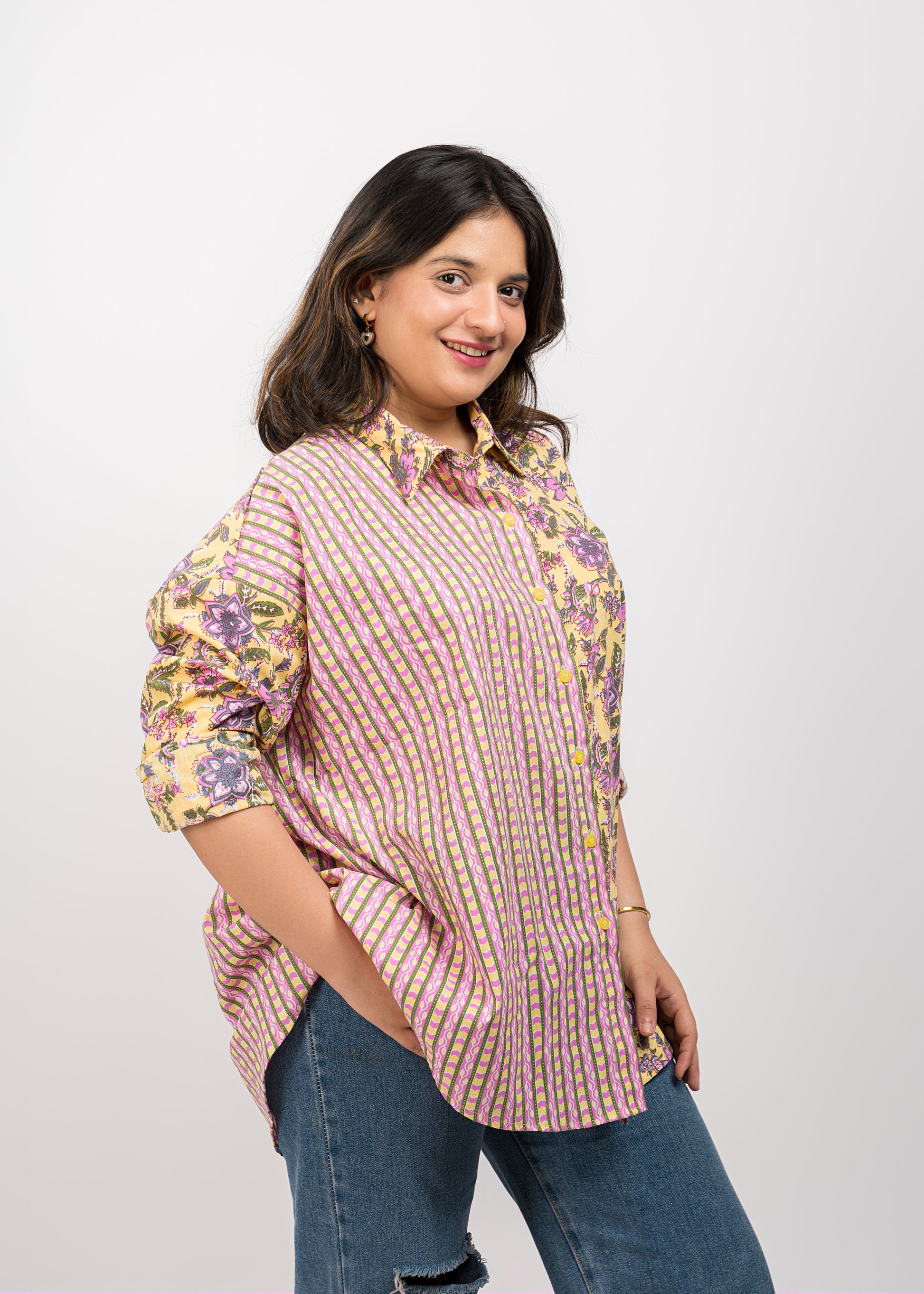 Cotton Oversize printed shirt with cuffed sleeves and regular collar detail. Breezy and versatile.